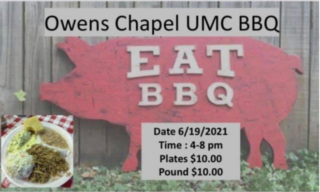 June * Vacation Bible School (TBA) 1 Bible Study 6:30 PM 2 Day UMW. (pending) 11:00 AM 2 Council Meeting 7:00 PM 6 Night UMW 6:00 PM 8 Bible Study 6:30 PM 13 Fellowship Dinner 12:00 Noon 15 Bible Study 6:30 PM 18 Hogs/Shoulders Pits 19 BBQ Supper 4-8:00 PM 20 Father’s Day 22 Bible Study 6:30 PM 29 Bible Study 6:30 PM